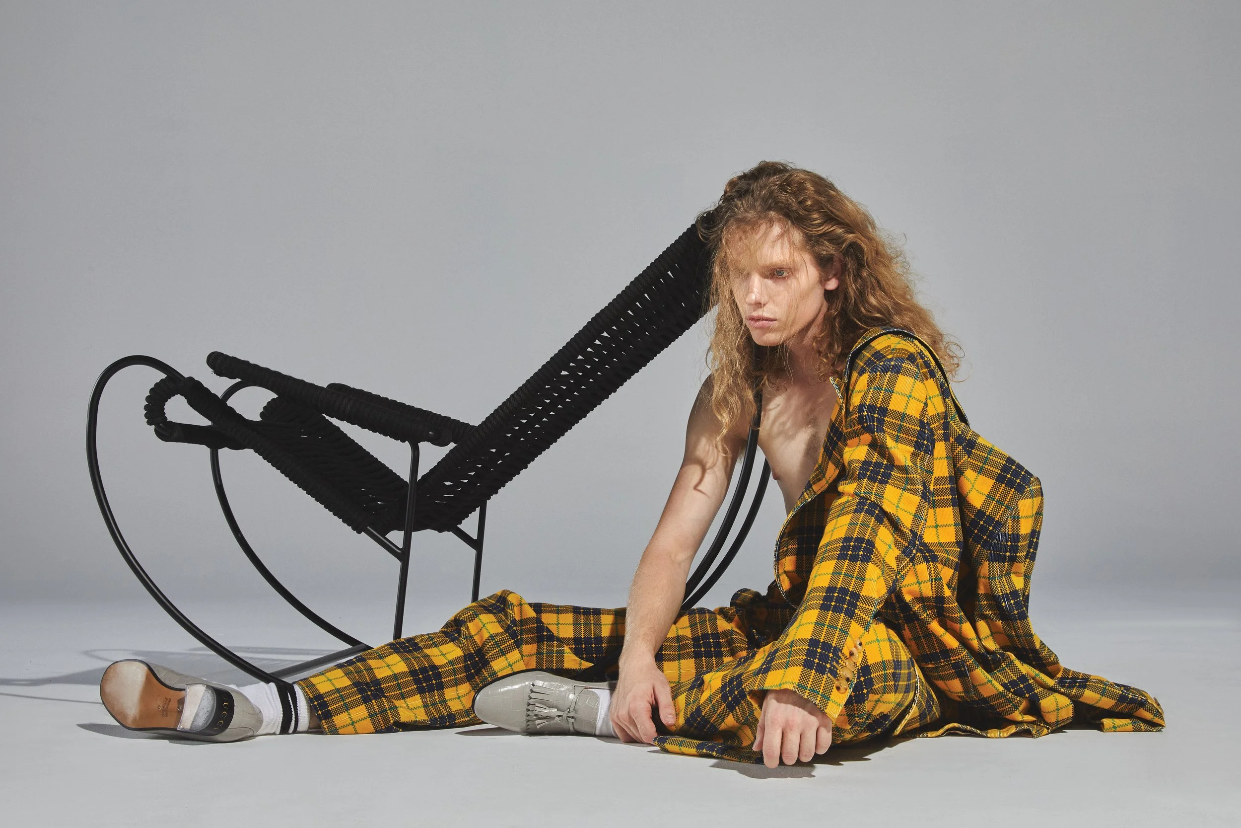 Miles wears GUCCI jacket, pants, and shoes and talent’s own socks.